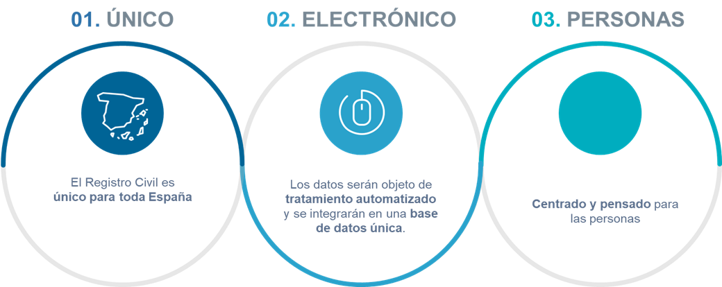 único y electrónico. Se basa en el establecimiento de una aplicación única, sobre la cual se inscribirán todos los hechos relativos al estado civil de las personas que deban acceder al Registro, se organizará la publicidad de la información registral en formato digital y se posibilitará el acceso telemático al mismo por los ciudadanos y funcionarios que son usuarios de la información que facilita el RC.